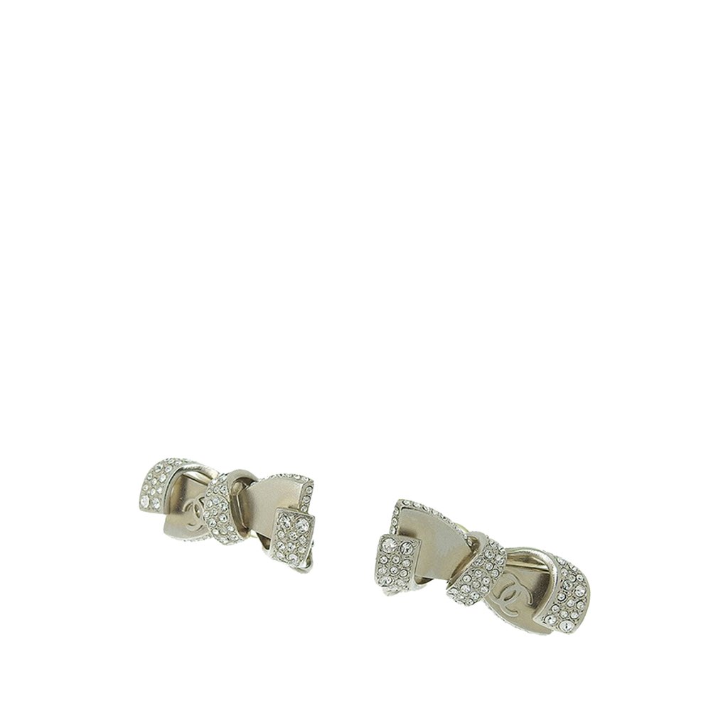 These earrings features a silver-plated metal body, rhinestones, and clip-on closures.