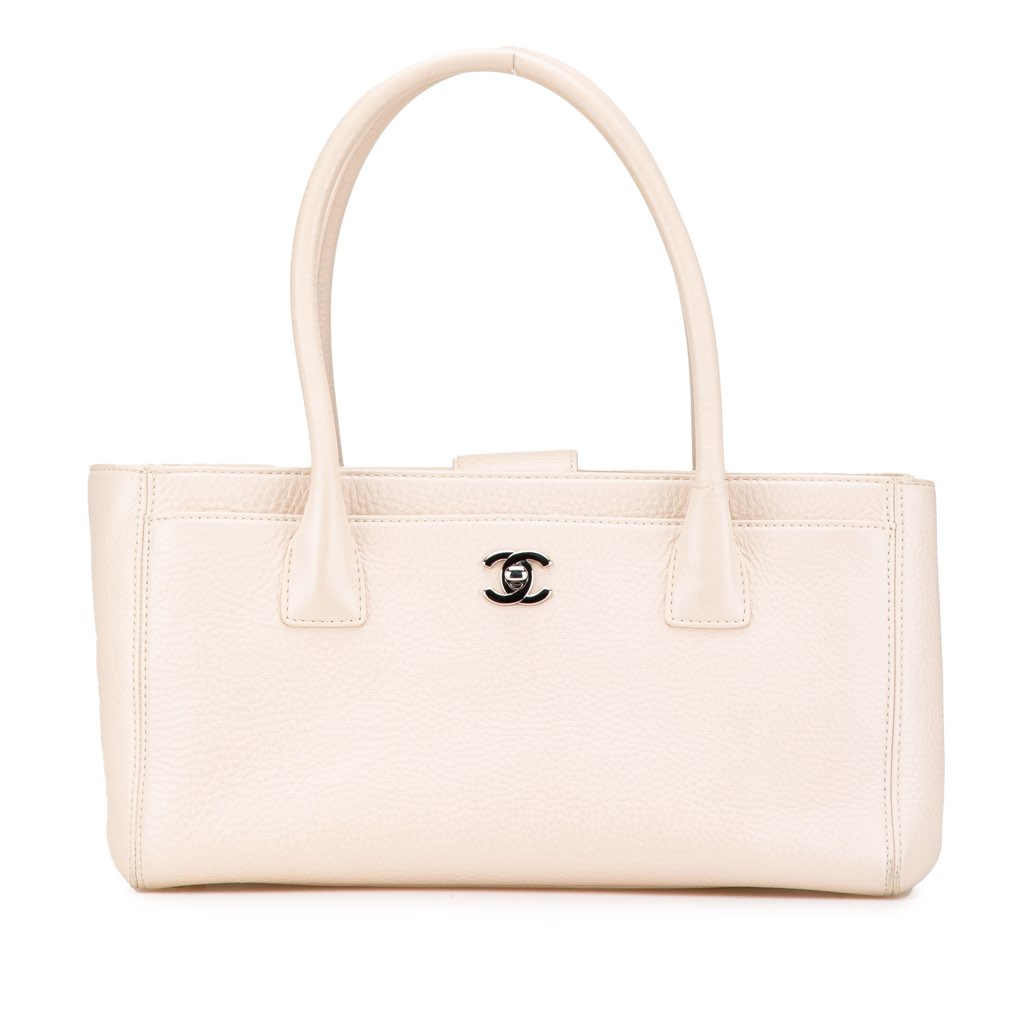 The Executive Cerf tote features a calf leather body, rolled leather handles, an open top with a front tab and a twist lock closure, exterior slip pockets, and an interior zip pocket.