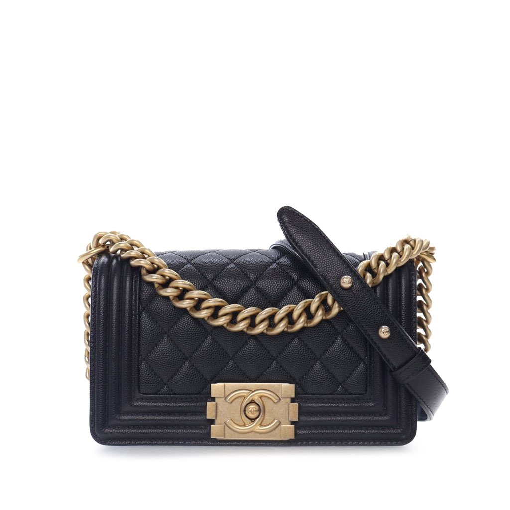 This crossbody bag features a quilted caviar leather body, a curb chain strap with leather guard, a front flap with a CC push-lock closure, and an interior slip pocket.
