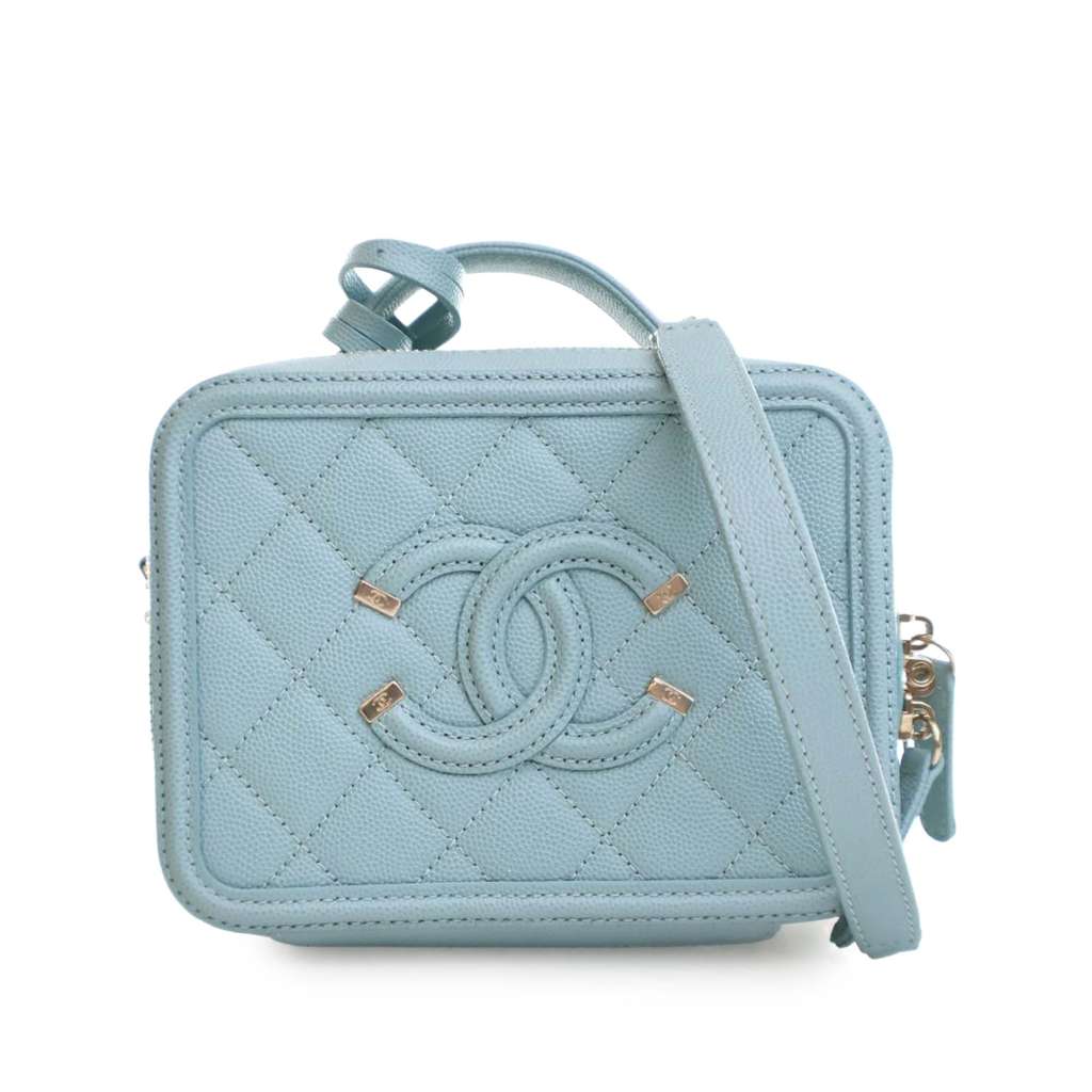 The Filigree Vanity Case features a quilted caviar leather body, a flat leather top handle, a leather woven chain strap with leather guard, a zip-around closure, and interior zip and slip pockets.