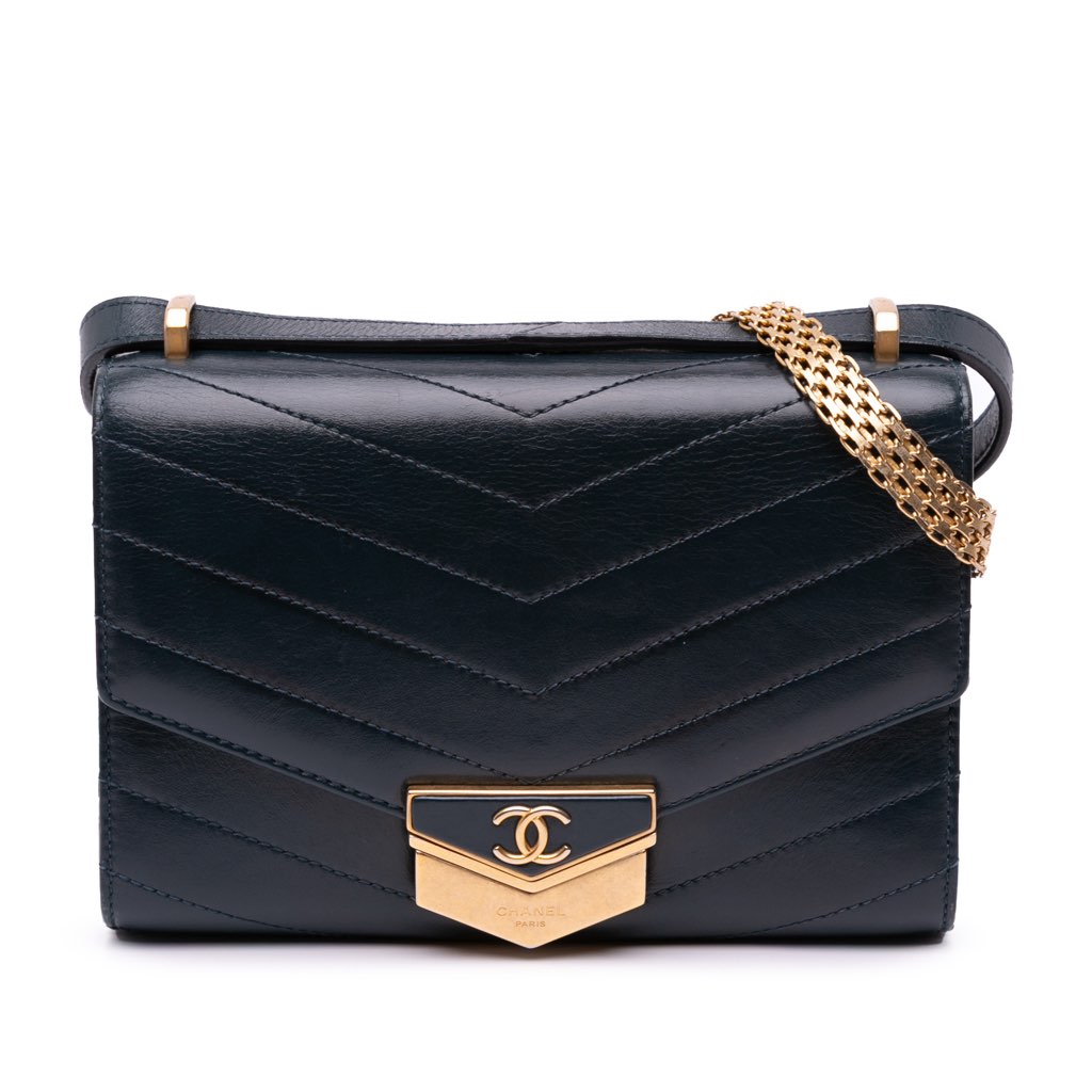 This crossbody bag features a quilted chevron calfskin leather body, a flat leather strap with gold-tone hardware detail, a flap with push lock closure, a top zip closure, and an interior slip pocket.