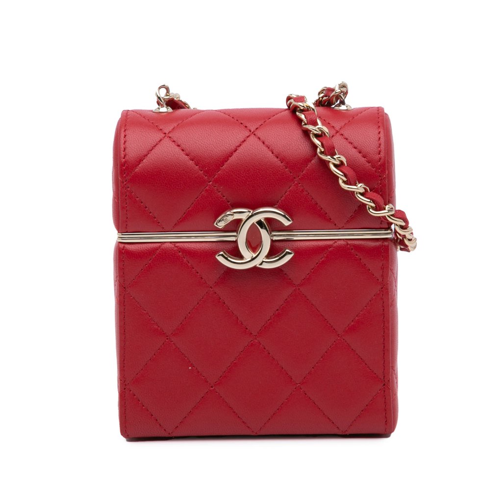 This crossbody features a quilted lambskin leather body, leather woven chain strap, a top flip lock closure, and interior slip pockets.