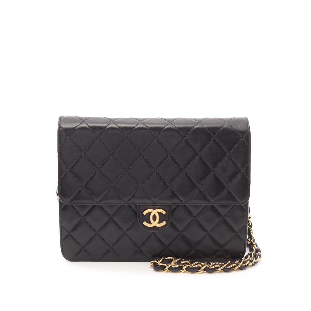 This crossbody bag features a quilted lambskin leather body, a leather woven chain strap, a front flap with CC turn lock closure, and interior zip pocket and slip pockets.