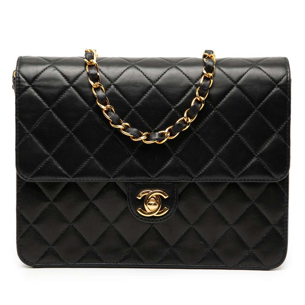 This crossbody bag features a quilted lambskin leather body, a leather woven chain strap, a front flap with push lock closure, and an interior zip pocket.