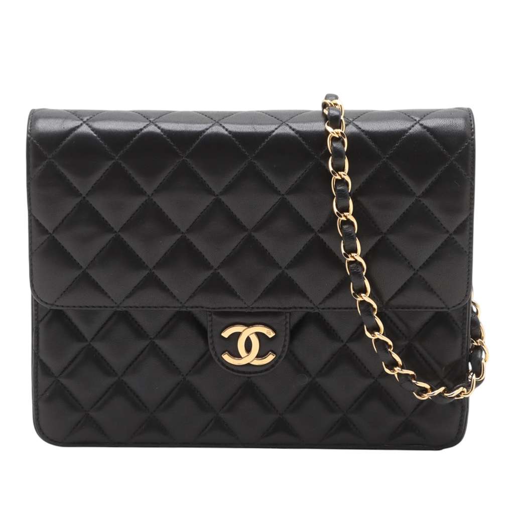 This crossbody bag features a quilted lambskin leather body, a leather woven chain strap, a front flap with push lock closure, and an interior zip pocket.