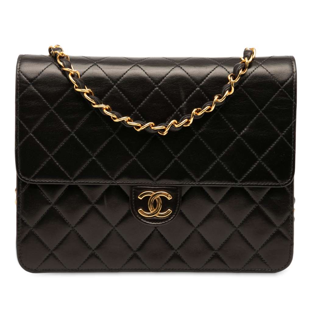 This crossbody bag features a quilted lambskin leather body, a leather woven chain strap, a front flap with push lock closure, and an interior zip pocket.