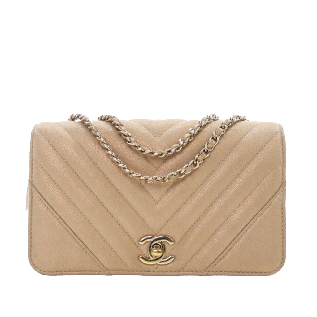 This shoulder bag features a quilted caviar leather body, leather-woven chain straps, a flap with CC turnlock closure, and interior zip and slip pockets.