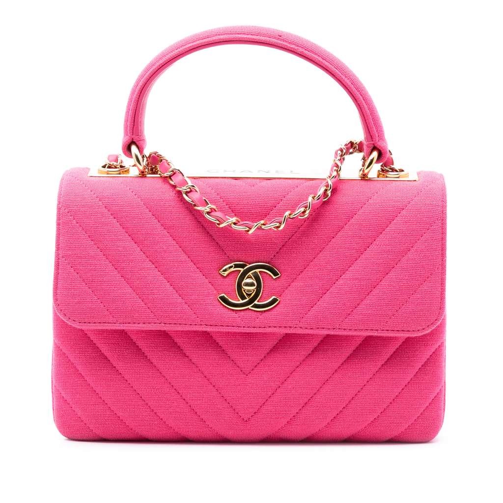The Trendy CC satchel features a quilted jersey body, a jersey top handle, a jersey woven chain link strap with shoulder guard, a front flap with CC turn-lock closure, an exterior back slip pocket, and interior zip and slip pockets.