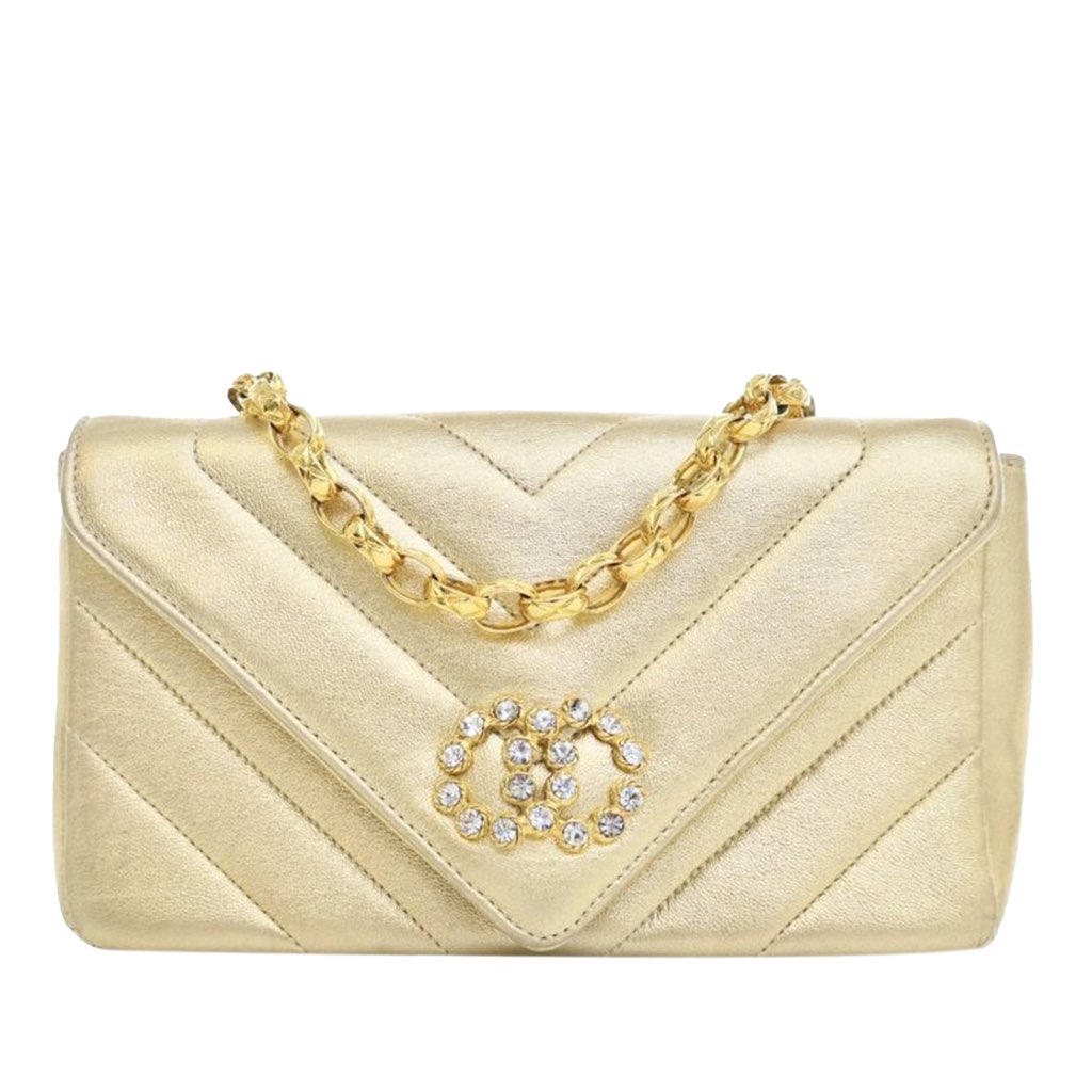 This flap features a quilted metallic lambskin leather body, a gold tone chain strap, a front flap with crystals detail and magnetic closure, and interior zip and slip pockets.