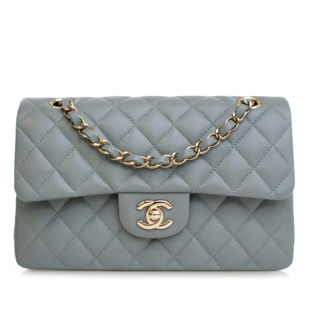 This shoulder bag features a quilted caviar leather body, leather woven chain straps, double front flaps with CC turn-lock closure, an exterior back slip pocket, and interior zip and slip pockets.