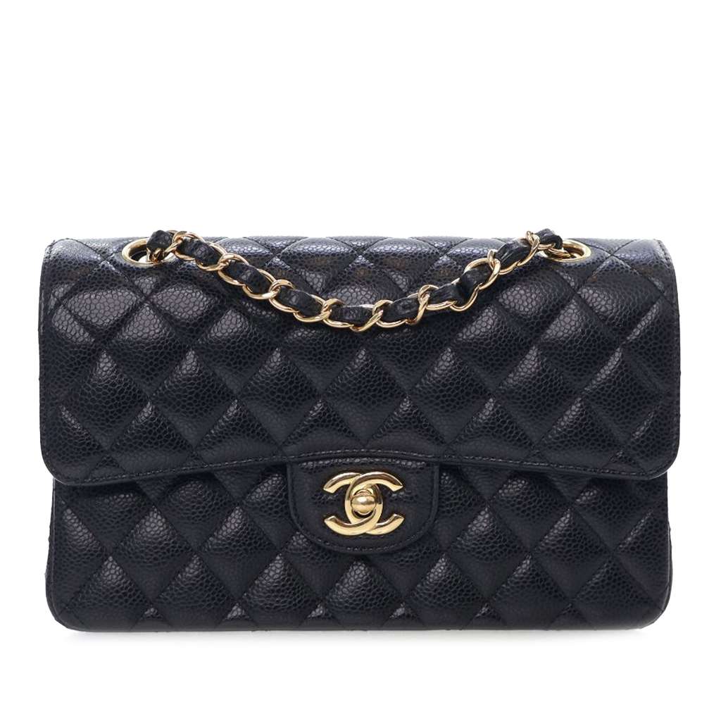 This shoulder bag features a quilted caviar leather body, leather woven chain straps, double front flaps with CC turn-lock closure, an exterior back slip pocket, and interior zip and slip pockets.