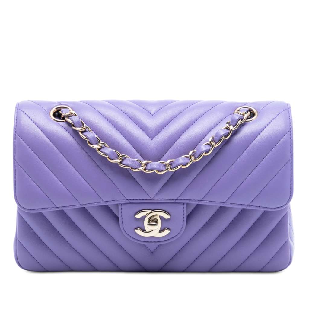 This shoulder bag features a quilted lambskin leather body, a leather woven chain link shoulder strap, front flaps with interlocking Cs and twist lock closure, an exterior back slip pocket, and interior zip and slip pockets.