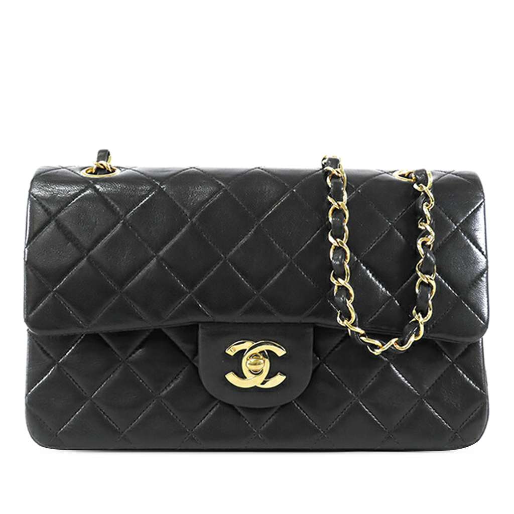 This shoulder bag features a quilted lambskin body, leather woven chain shoulder straps, double front flaps with interlocking Cs and a twist lock closure, an exterior back slip pocket, and interior zip and slip pockets.