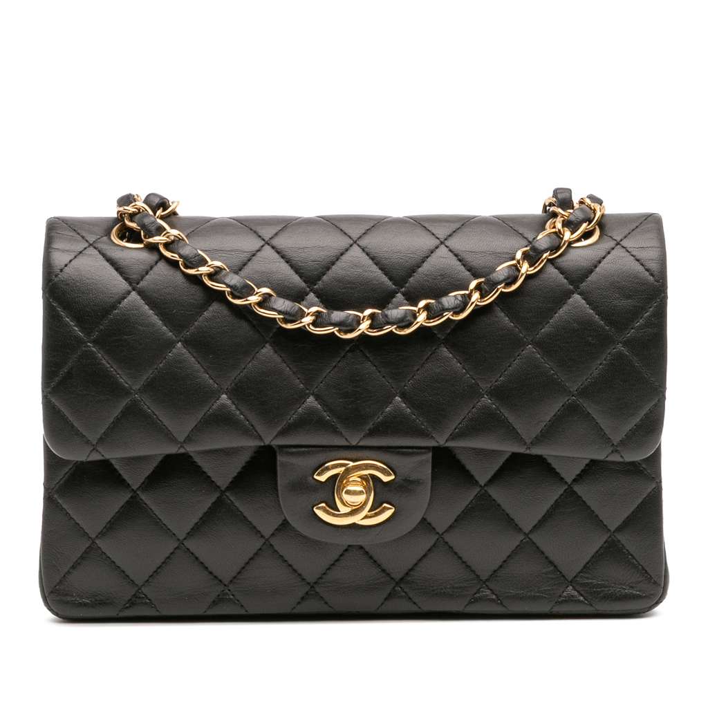 This shoulder bag features a quilted lambskin body, an exterior back slip pocket, leather woven chain straps, double front flaps with interlocking Cs and a twist lock closure, and interior zip and slip pockets.