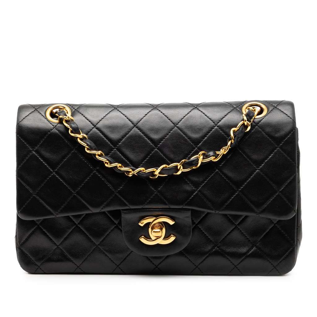 This shoulder bag features a quilted lambskin body, leather woven chain shoulder straps, double front flaps with interlocking Cs and a twist lock closure, an exterior back slip pocket, and interior slip pockets.