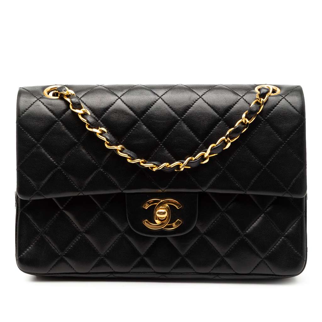 This shoulder bag features a quilted lambskin body, leather woven chain shoulder straps, double front flaps with interlocking Cs and a twist lock closure, an exterior back slip pocket, and interior zip and slip pockets.
