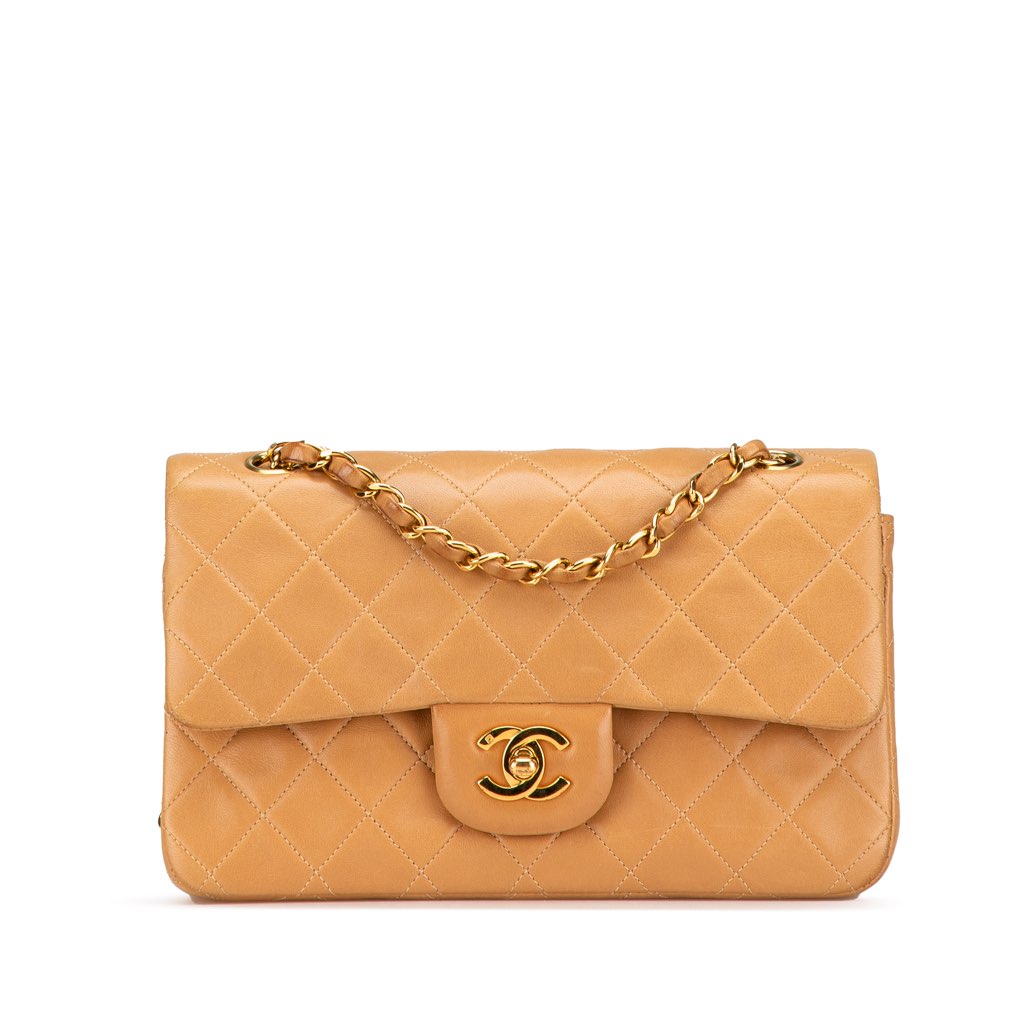 The Classic Double Flap bag features a quilted lambskin leather body, leather woven chain link shoulder straps, double front flaps with interlocking Cs and a twist-lock closure, an exterior back slip pocket, and interior slip pockets.