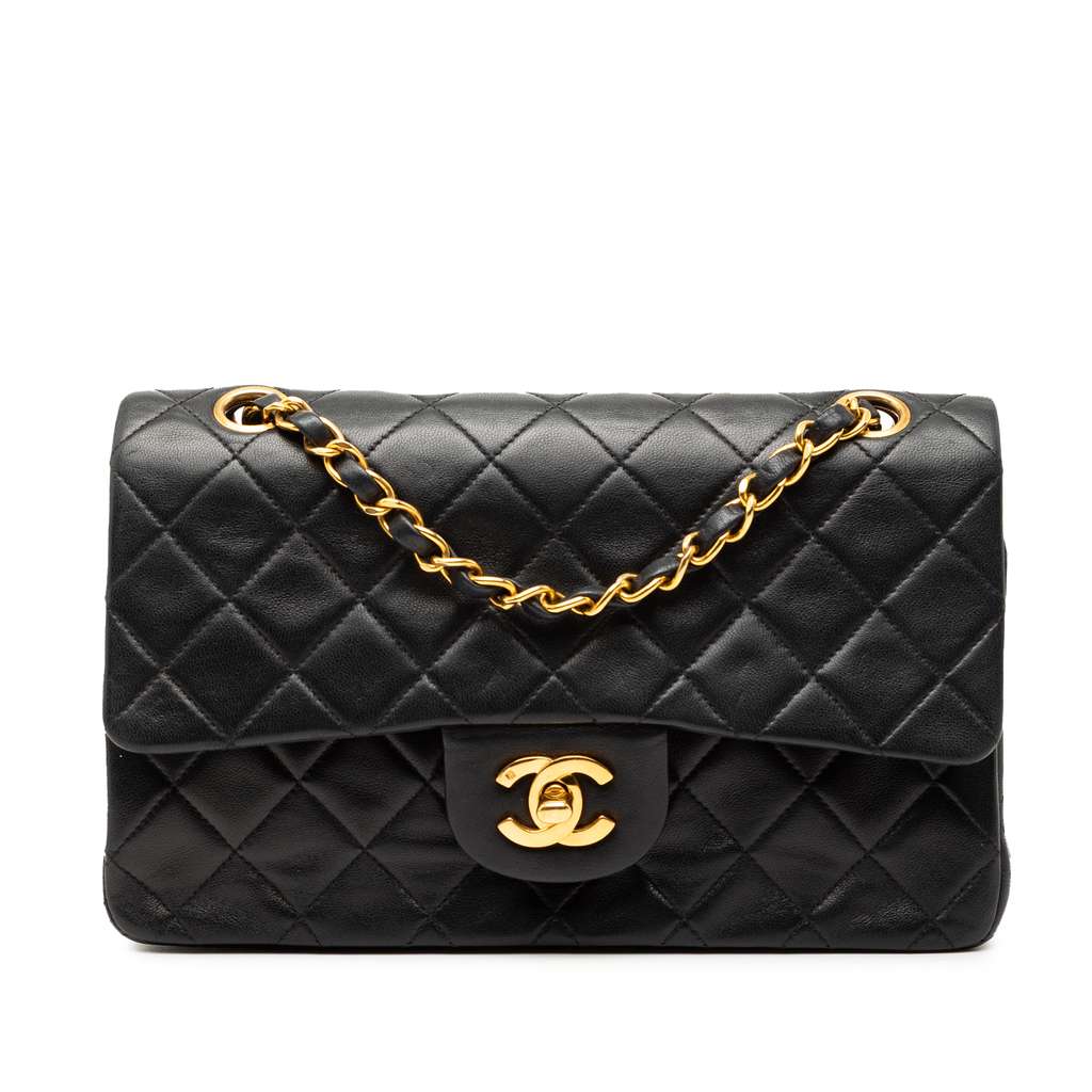 This shoulder bag features a quilted lambskin body, leather woven chain shoulder straps, double front flaps with interlocking Cs and a twist lock closure, an exterior back slip pocket, and interior slip pockets.