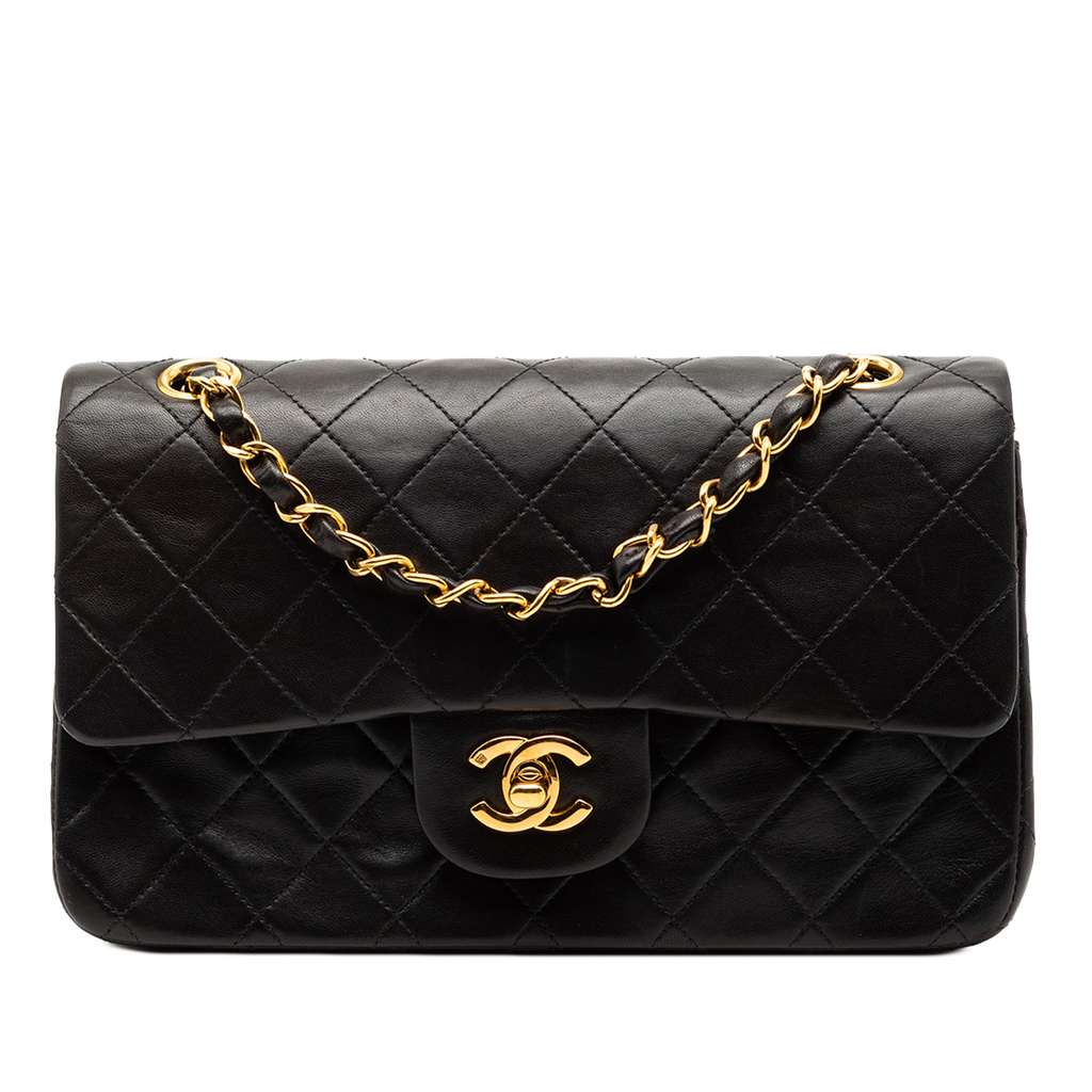 This shoulder bag features a quilted lambskin body, leather woven chain shoulder straps, double front flaps with interlocking Cs and a twist lock closure, an exterior back slip pocket, and interior zip and slip pockets.