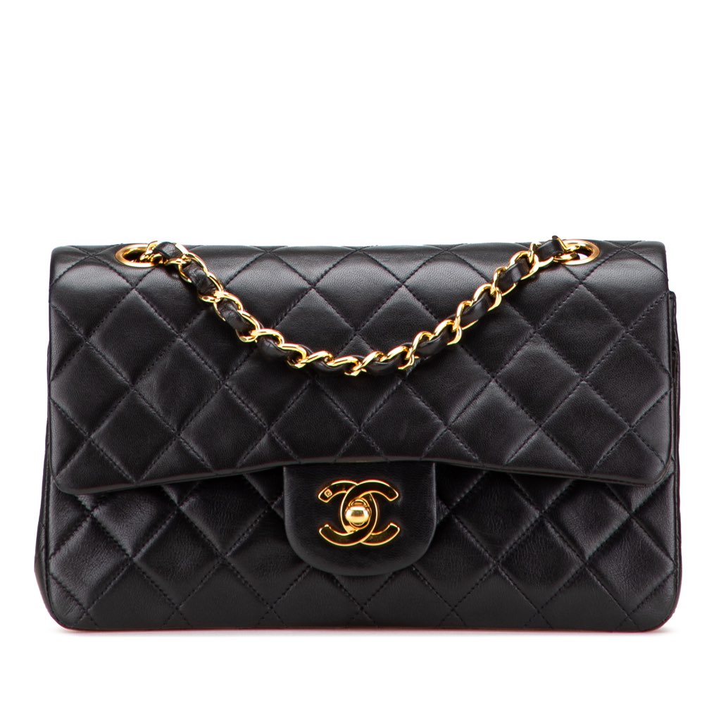This shoulder bag features a quilted lambskin body, leather woven chain shoulder straps, double front flaps with interlocking Cs and a twist lock closure, an exterior back slip pocket, and interior zip and slip pockets.