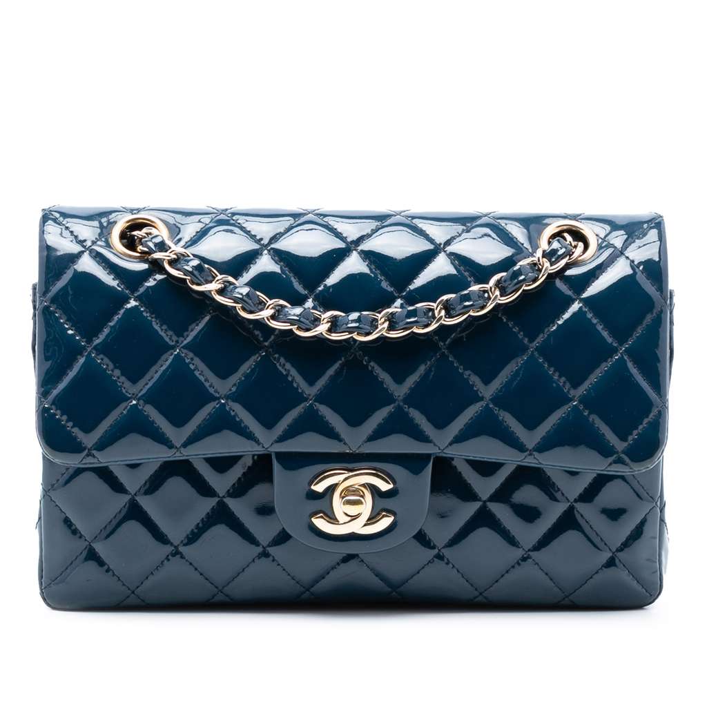 This shoulder bag features a quilted patent leather body, leather woven chain shoulder straps, double front flaps with CC turn-lock closure, an exterior back slip pocket, and interior slip pockets.