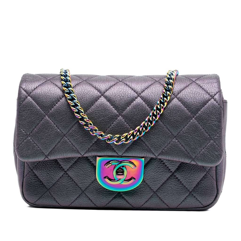 This satchel features a goatskin leather body, a removable leather woven chain link shoulder strap, a detachable flat leather waist strap, a front flap with interlocking Cs and twist lock closure, and an interior zip pocket.