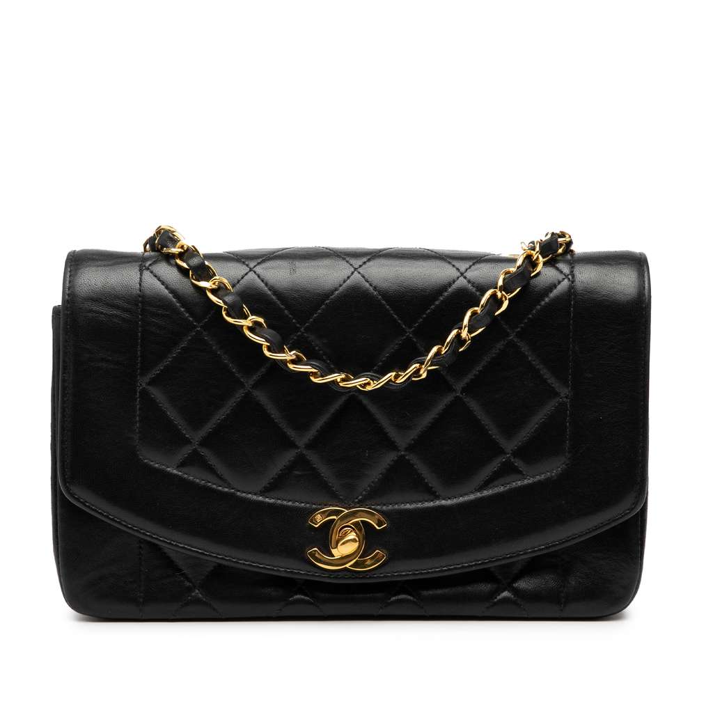 This crossbody bag features a quilted lambskin body, a leather woven chain shoulder strap, a front flap with interlocking Cs and a twist lock closure, and interior zip and slip pockets.