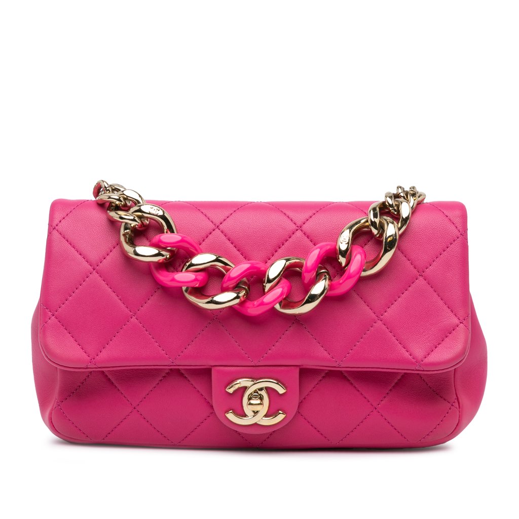This satchel features a quilted lambskin leather body, a leather-woven chain and acrylic handle, a leather-woven chain link shoulder strap with a leather guard, a front flap with a CC turn-lock closure, an exterior back pocket, and an interior zip pocket. The exterior front has been retouched.