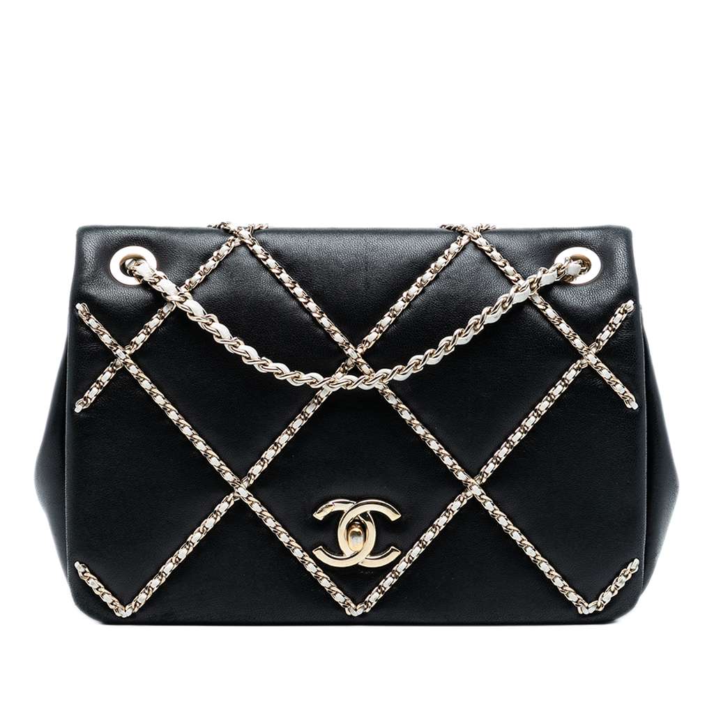 This flap bag features a quilted lambskin body, a leather-woven chain strap with leather guard, a front flap with interlocking Cs and a twist lock closure, and an interior zip pocket.