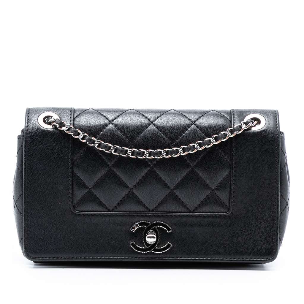 The Mademoiselle Flap features a quilted lambskin leather body, a leather woven chain strap with leather shoulder guard, double front flaps with CC turn lock and magnetic snap closure, and an interior zip pocket.