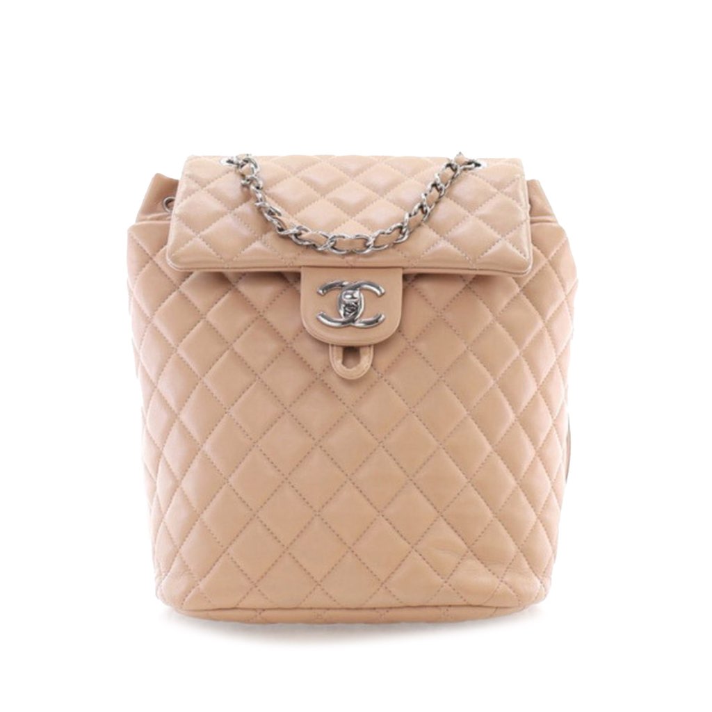 The Urban Spirit features a quilted lambskin leather body, a leather woven chain top handle, flat leather back straps, a flap with twist lock closure, a drawstring closure, an exterior back slip pocket, and an interior slip pocket.