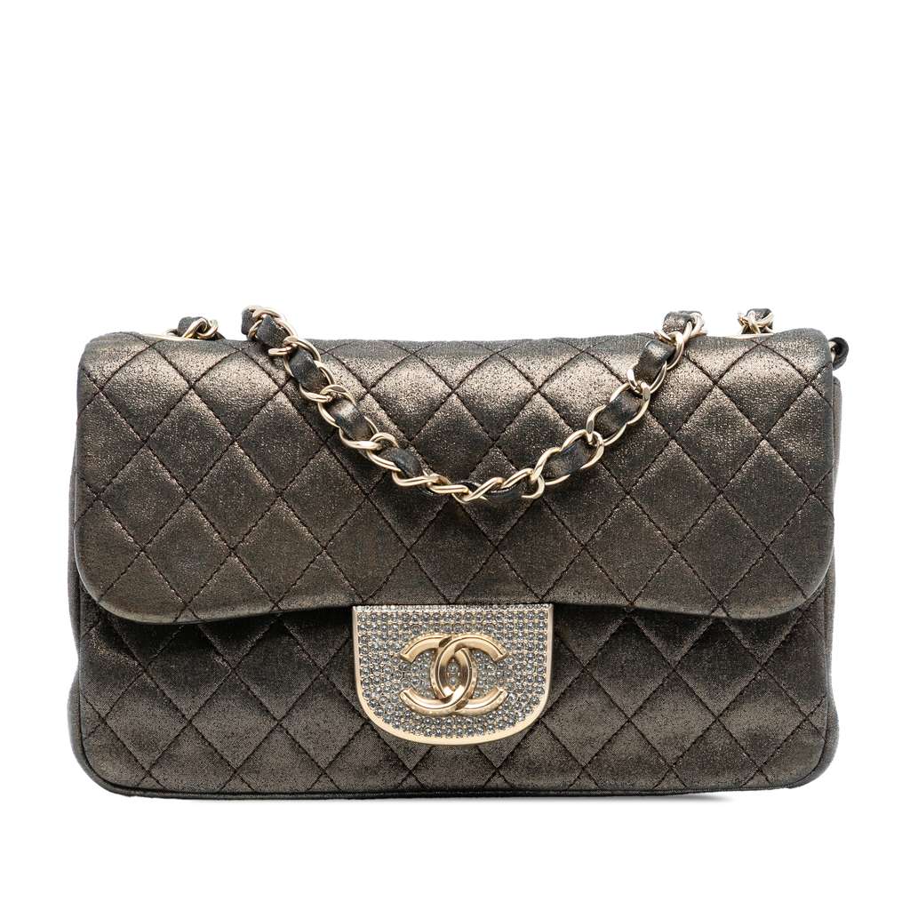 This flap bag features a quilted metallic iridescent fabric, woven-in fabric chain shoulder strap, crystal embellished CC logo, a front flap closure with magnetic snap closure, and an interior zip pocket.