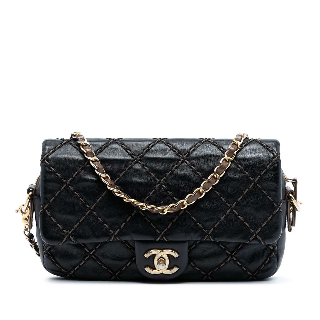 This crossbody bag features a quilted calf leather body, a detachable leather woven chain strap with leather shoulder guard, a front flap with turn lock closure, and an interior zip compartment with zip pocket.