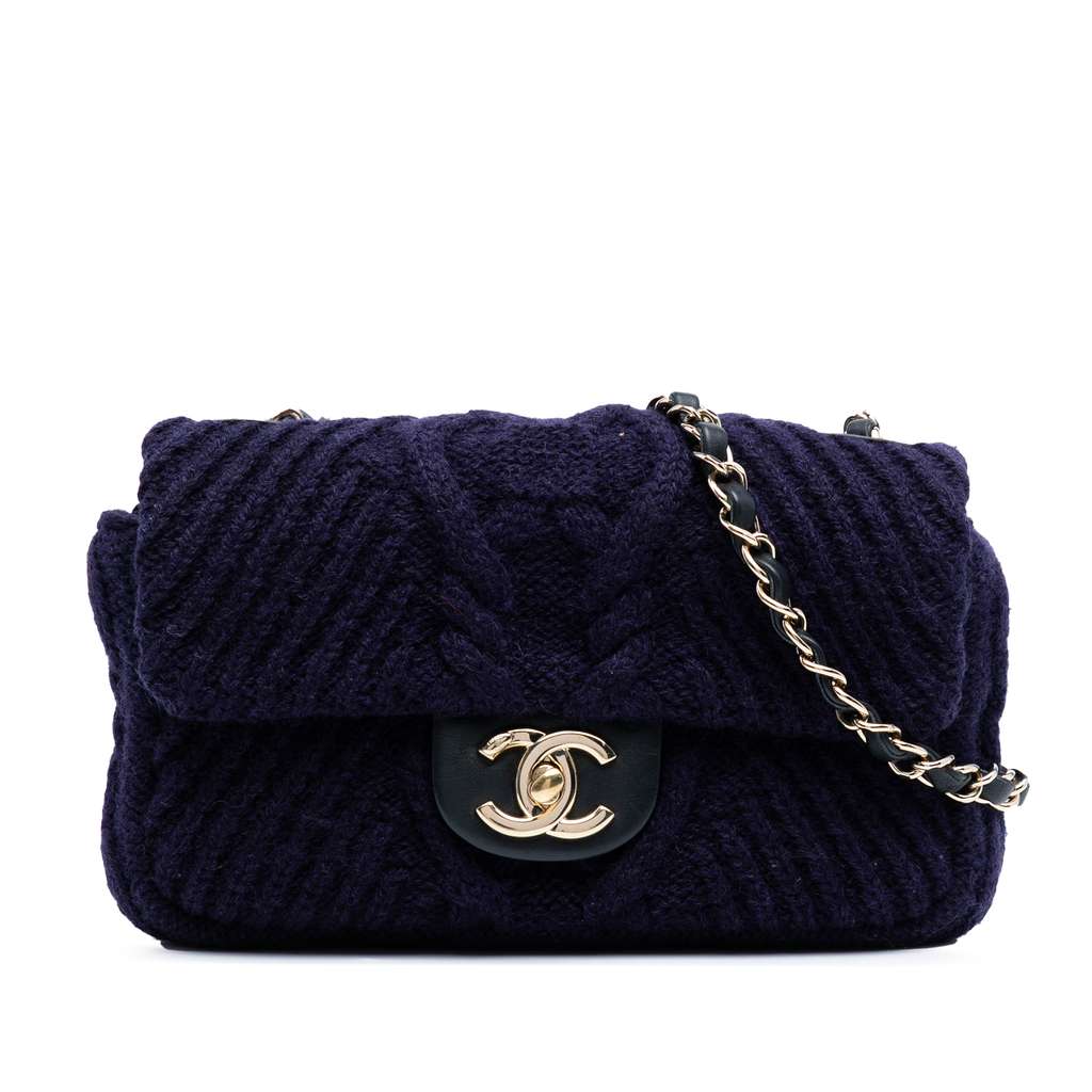 This shoulder bag features a knit fabric body, a gold-tone leather woven chain link shoulder straps, a front flap with interlocking Cs and a twist lock closure, an exterior back slip pocket, and interior zip and slip pockets.