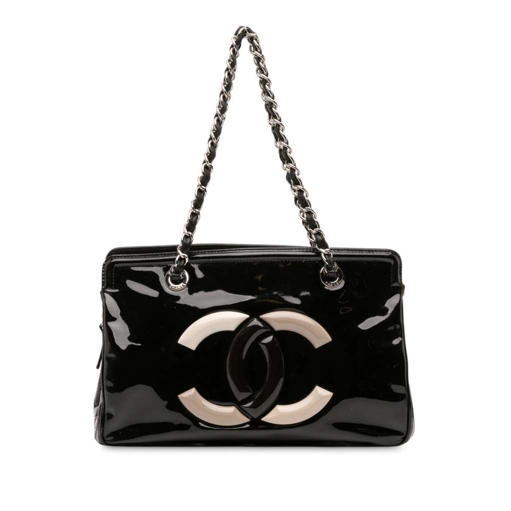 The Lipstick tote bag features a patent leather body, silver-tone leather-woven chain straps, an open top, and interior zip and slip pockets.
