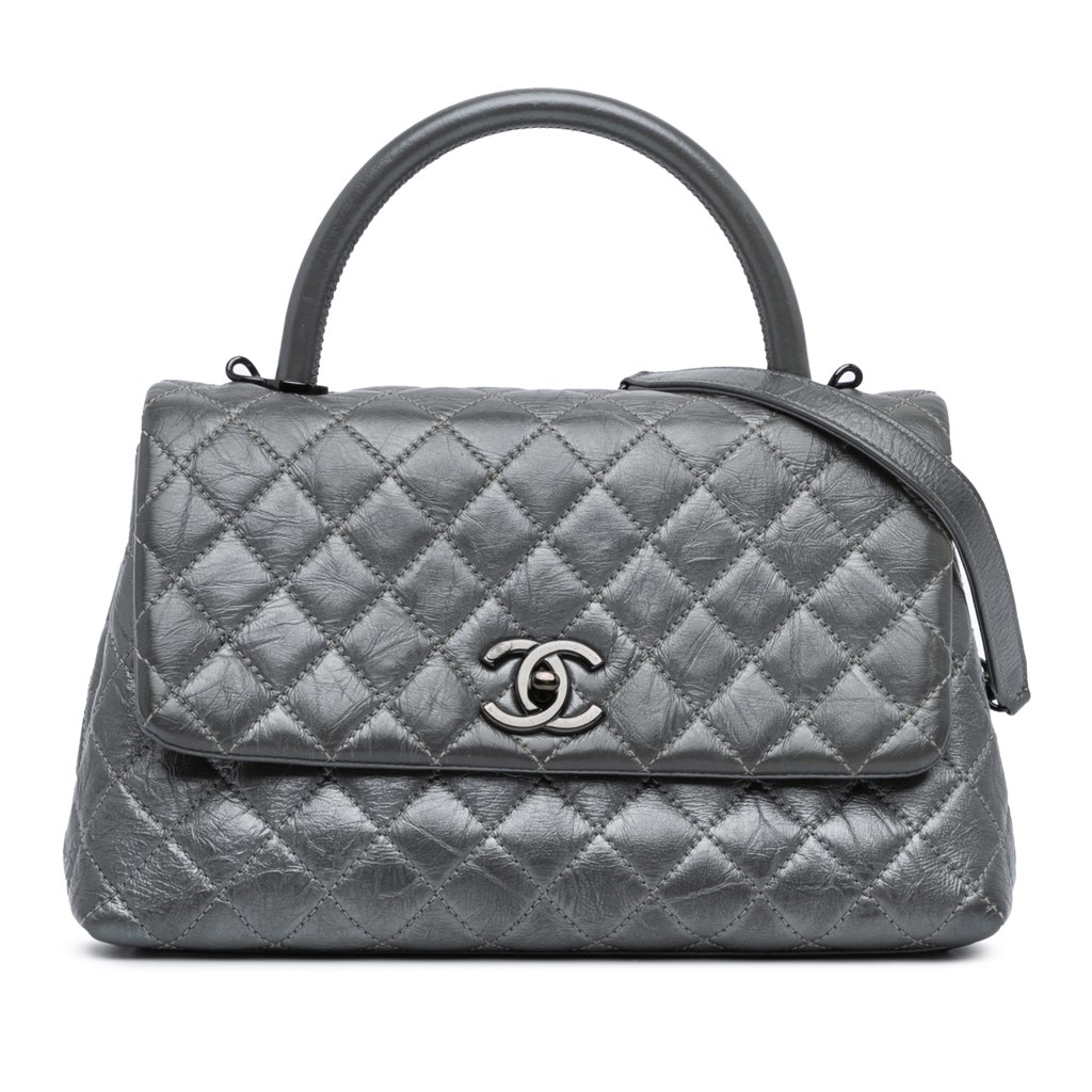This satchel features a quilted leather body, a rolled leather top handle, a detachable leather-woven chain strap with leather shoulder guard, a flap with interlocking Cs turnlock closure, an exterior back slip pocket, an interior zip compartment, and interior zip and slip pockets.
