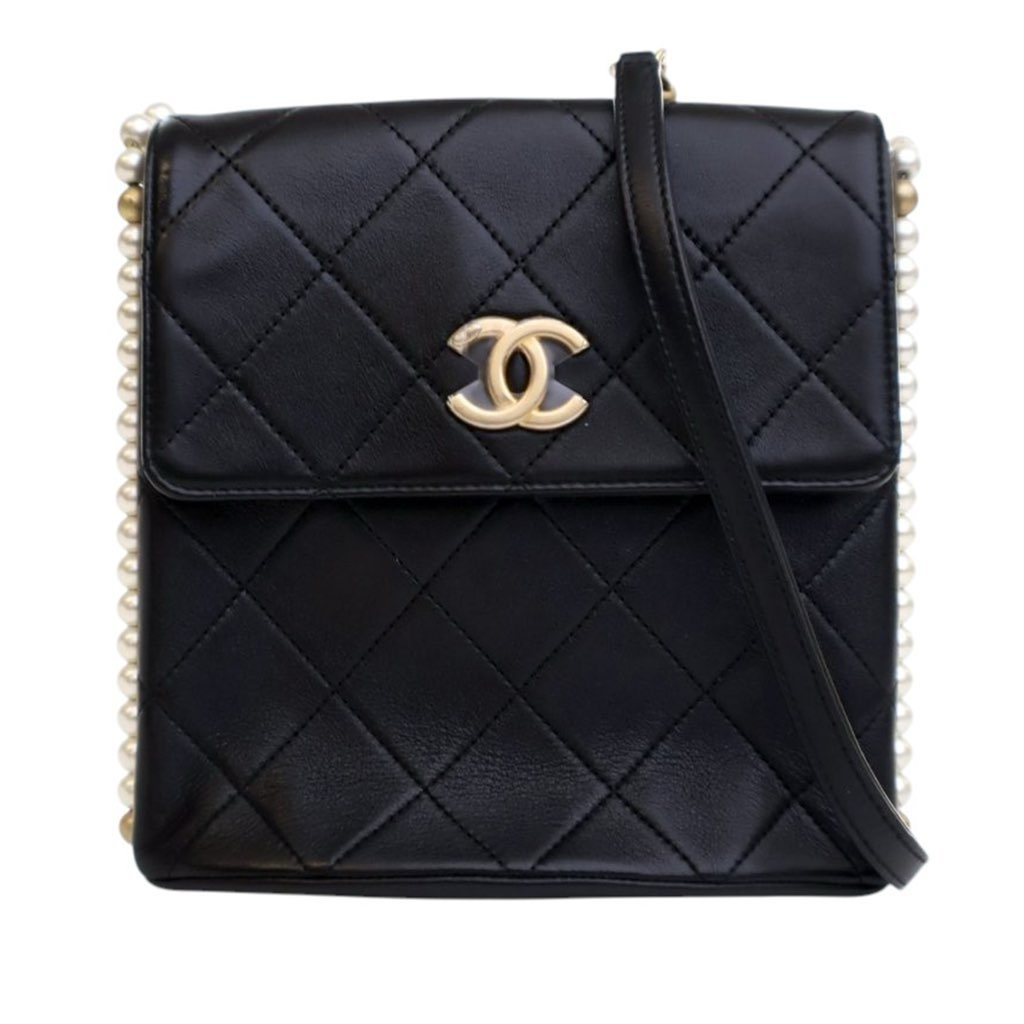 This crossbody bag features a quilted calfskin leather body, faux pearls strap with leather shoulder guard, a front flap with magnetic snap button closure, an exterior back slip pocket, and an interior slip pocket.