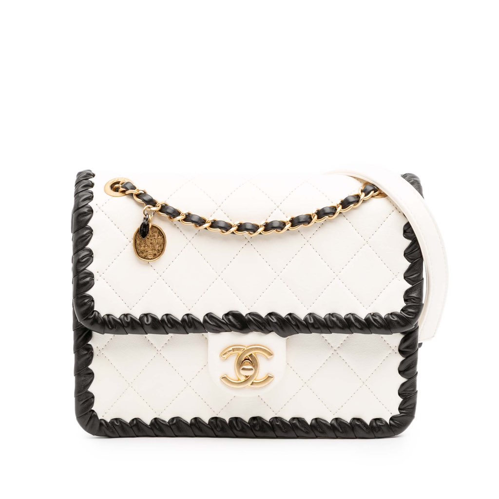 This crossbody bag features a leather body with braided details, a leather woven chain strap with leather guard, a front flap with turn lock closure, and an interior zip pocket. Exterior front and back parts are repainted.