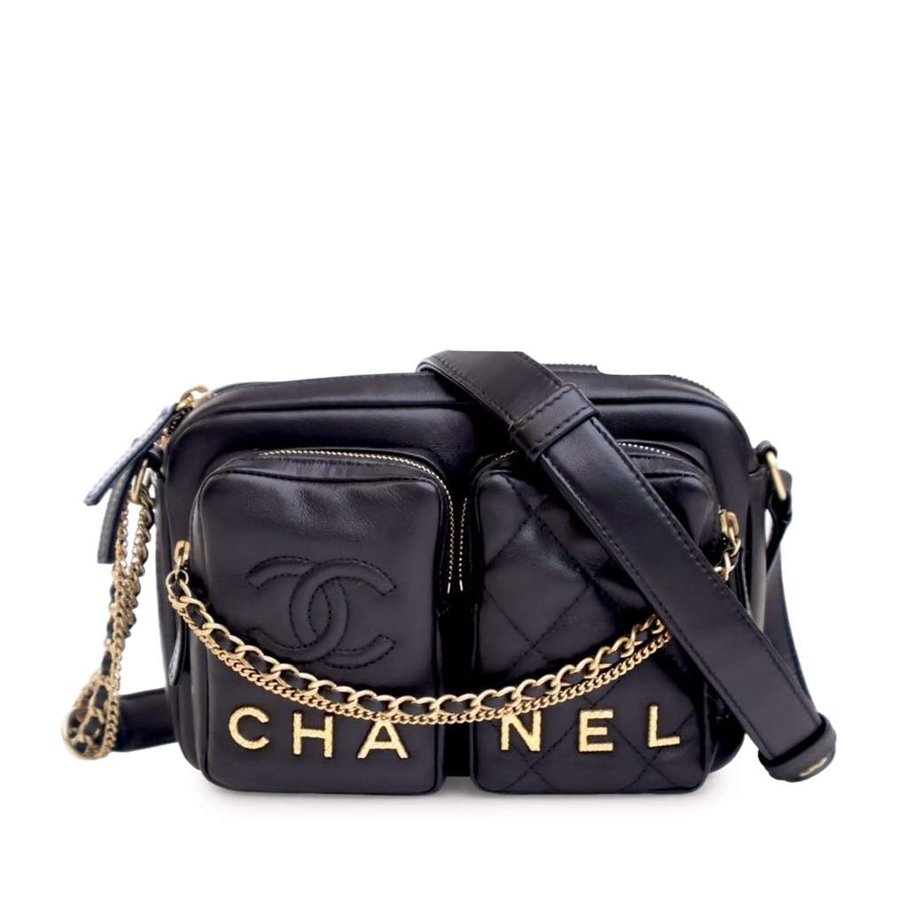 This camera case features a leather body, an adjustable flat leather strap with leather woven chain, a top zip closure, and front exterior zip pockets with chain and leather woven chain.