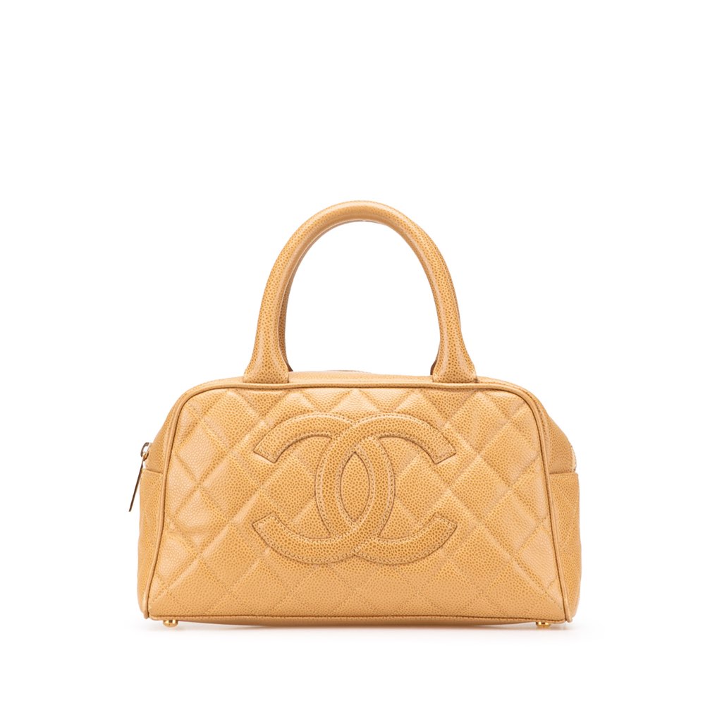 This handbag features a quilted caviar leather body, rolled handles, a top zip closure, an exterior back slip pocket, and interior zip and slip pockets.
