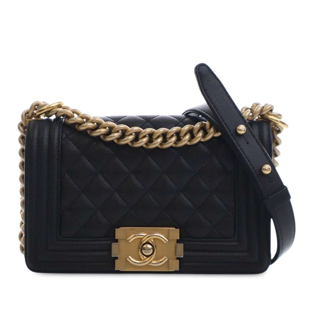 This crossbody bag features a quilted caviar leather body, a curb chain strap with leather guard, a front flap with a CC push-lock closure, and an interior slip pocket.