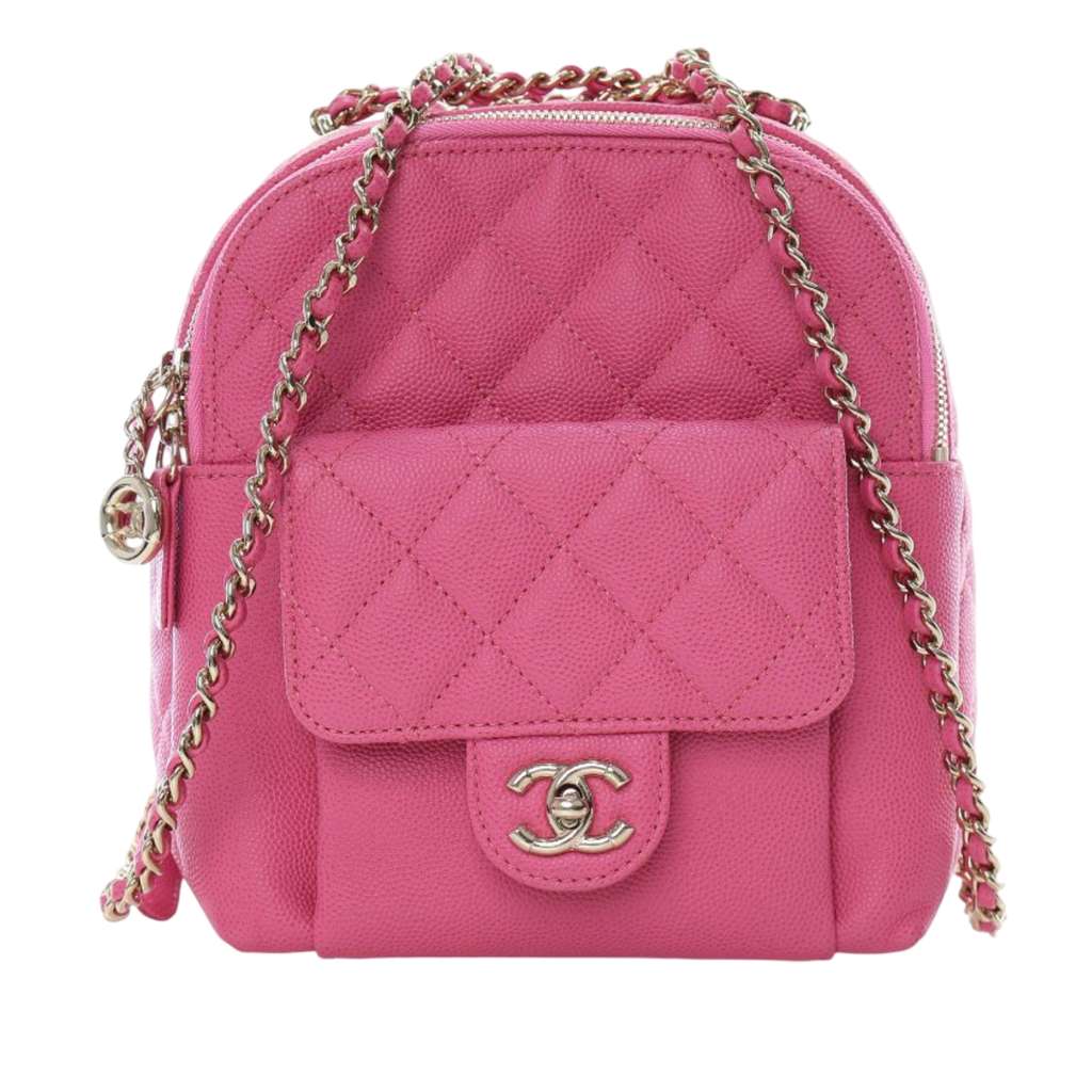 This backpack features a quilted caviar leather body, flat leather and leather woven chain back straps, a two-way top zip closure, an exterior front flap pocket with a CC turn lock closure, and an interior slip pocket.