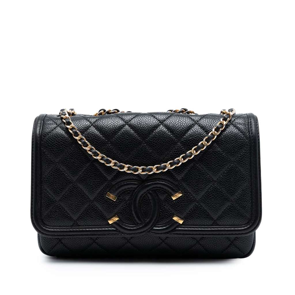 The Filigree flap bag features a quilted caviar leather body, a leather woven chain shoulder strap with leather guard, a front flap with magnetic snap closure, an exterior back slip pocket, and interior zip and slip pockets. Exterior back and interior lining has been repainted.