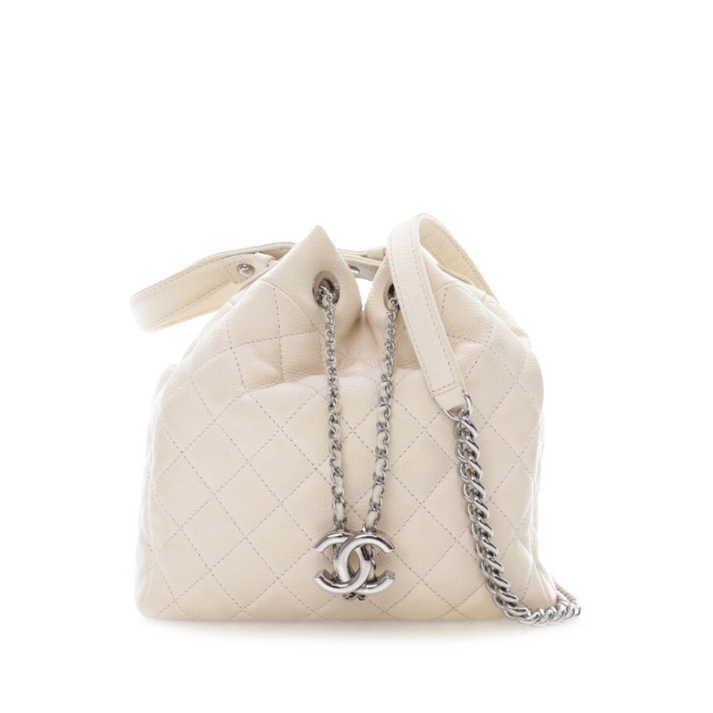 This bucket bag features a quilted caviar leather body, a flat leather handle, a detachable chain strap with leather guard, and an open top with a leather-woven chain drawstring closure.