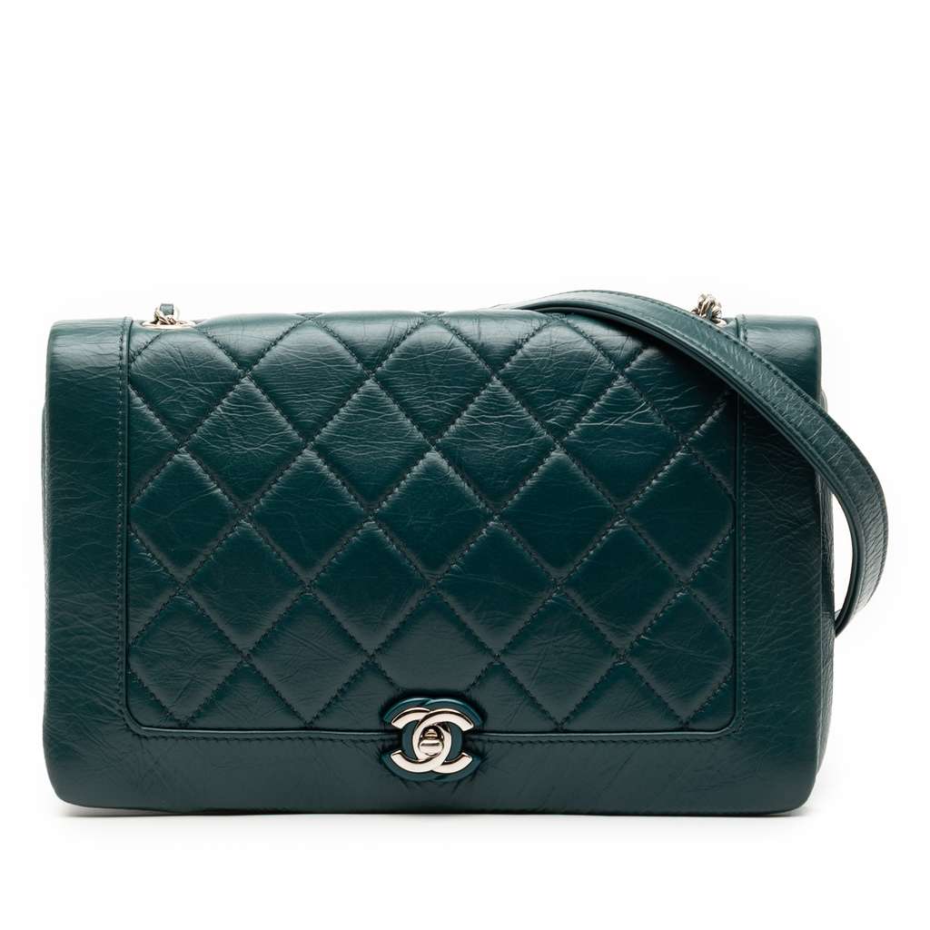 The Bi Vintage bag features a quilted crumpled calf leather body, a leather-woven chain strap with leather shoulder guard, a flap with CC turn-lock closure, an exterior back slip pocket, and an interior zip pocket.