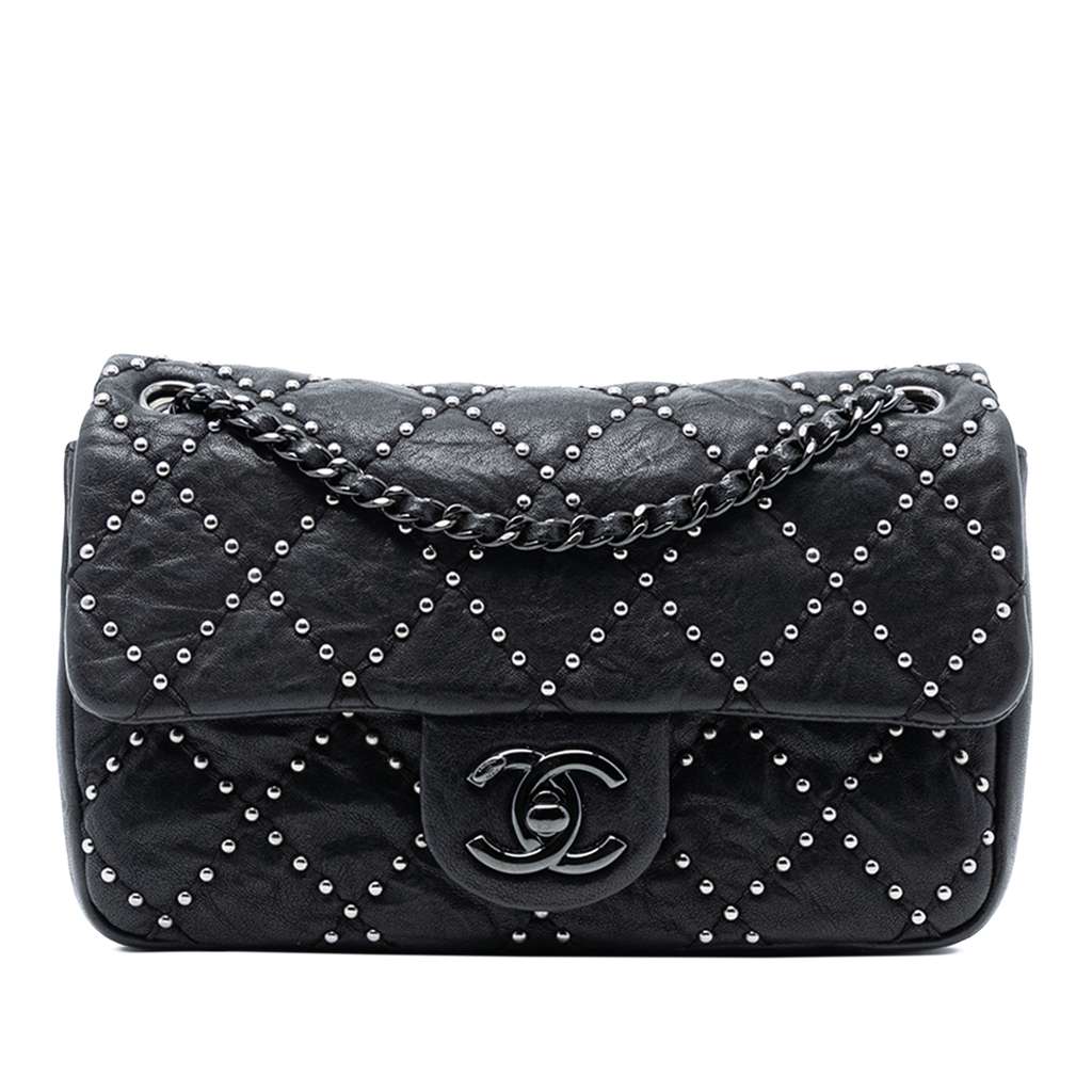 This flap features a quilted leather body with stud details, a leather woven chain strap, a front flap with a twist-lock closure, and interior zip and slip pockets.