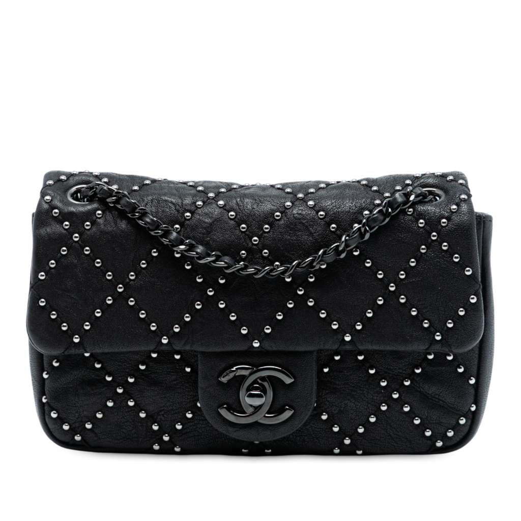 This flap features a quilted leather body with stud details, a leather woven chain strap, a front flap with a twist-lock closure, and interior zip and slip pockets.