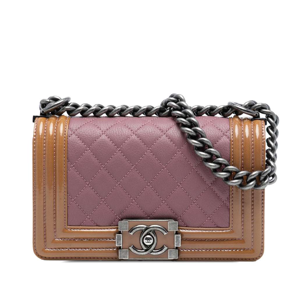 The Boy flap features a quilted goatskin leather and patent leather body, a curb chain strap, a front flap with a push lock closure, and an interior slip pocket.