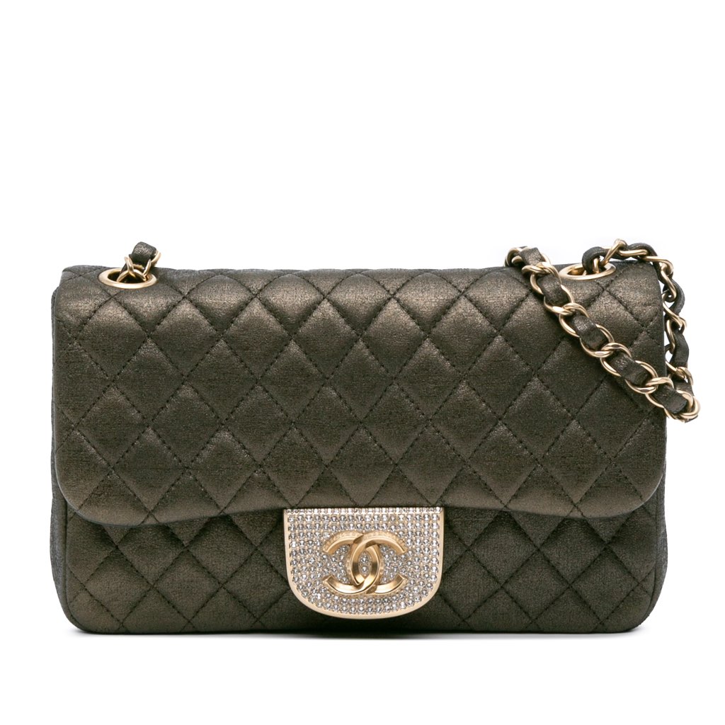 This crossbody bag features a leather body, leather woven chain link shoulder strap, crystal embellished CC logo, a front flap closure with magnetic snap closure, and an interior zip pocket.