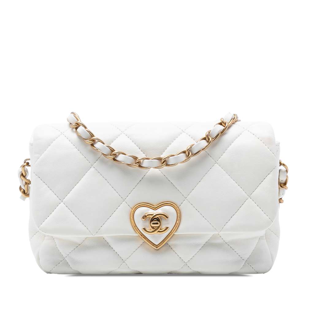 This crossbody bag features a quilted lambskin leather body, a leather woven chain strap with leather guard, a front flap with plexiglass interlocking Cs and twist lock closure, an exterior back slip pocket, and interior zip and slip pockets. Exterior front has been repainted.